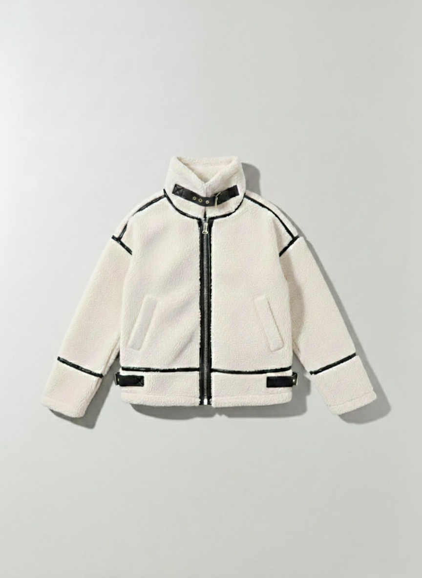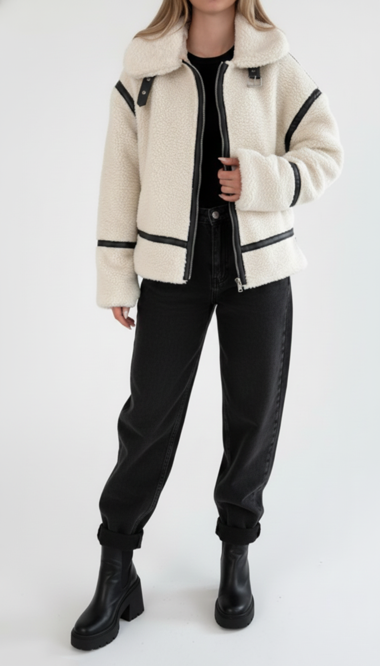 Veste chaude et tendance en mouton retourné, rehaussée de finitions en cuir contrastées. Sa coupe biker structurée, son col enveloppant et sa fermeture zippée apportent un style moderne et affirmé. Idéale pour un look urbain chic au quotidien.